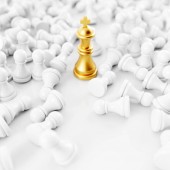 Złoty Pawn stoi wśród ogromnego tłumu czarnych pionów, ilustracja 3D