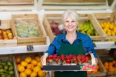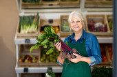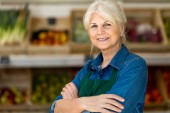 Starsza kobieta pracuje w małym sklepie spożywczym