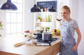 Atrakcyjna kobieta trzymająca szklankę soku pomarańczowego stojąc w kuchni