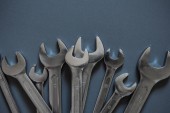 Zestaw narzędzi do naprawiania kluczy na szarym tle z płaską przestrzenią na kopie w widoku z góry