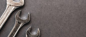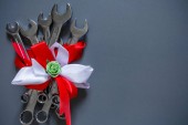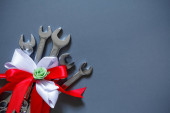 Zestaw narzędzi do naprawiania kluczy na szarym tle z płaską przestrzenią na kopie w widoku z góry