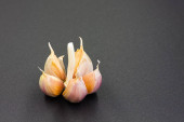 Świeży pachnący czosnek zbliżenie na ciemnym tle z kopią przestrzeni w stylu rustykalnym