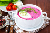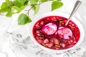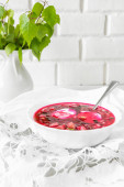 Tradycyjna zimna zupa z okroshka z Burak, ogórka i wiosną cebuli wiosną wegetariańskie danie super jedzenie na jasnym tle z kopią przestrzeni w stylu rustykalnym