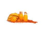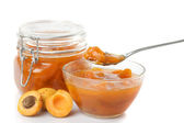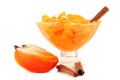 Persimmon świeże owoce soczyste i dżem w szklany słoik na białym tle z bliska