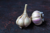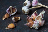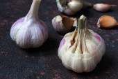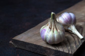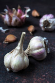 cebulki czosnku na ciemnym tle, zbliżenie