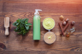 Kobieta sprawia, że kosmetyki ręcznie robione na drewnianym stole;