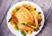 Pieczony kurczak z czosnkiem na drewnianej tacy. Widok z góry, Góra
