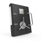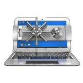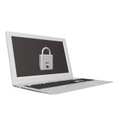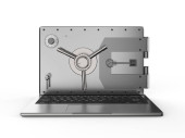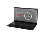 koncepcja bezpieczeństwa i ochrony laptopa. laptop z bezpiecznych drzwi na białym tle