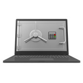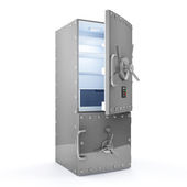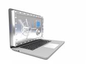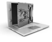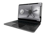 koncepcja bezpieczeństwa i ochrony laptopa. laptop z bezpiecznych drzwi na białym tle