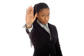 Czarny African American kobieta biznesmen na białym tle robi gest zatrzymania