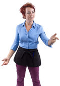 Black African American kobieta biznesmen na białym tle reklamy i skierowany w dół