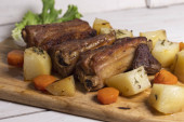 Zdjęcie "Pieczone żeberka wieprzowe z ziemniakami tymianku na białym tle drewnianym, kuchnia Wschodnia" może być wykorzystywane do celów osobistych i komercyjnych zgodnie z warunkami zakupionej licencji Royalty-free. Obraz jest dostępny do pobrania w jakości wysokiej rozdzielczości do 5760x3840.