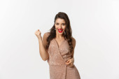 Atrakcyjna brunetka dziewczyna w różowej sukni.