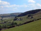 malowniczy widok na ścieżkę na skraju Moorland w Calderdale West Yorkshire z szorstkiej trawy Tussock z suchych kamiennych ścian graniczących z pastwisk z gospodarstw rolnych i wzgórza Pennine widoczne w oddali