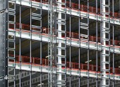 Widok dużego budynku budowlanego w budowie ze stalowymi ramami i dźwimienkami wspierającymi metalowe podłogi z ogrodzeń bezpieczeństwa i wciągników