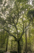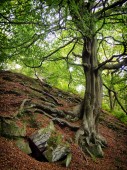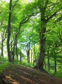 wysokie wiosenne lasy bukowe z tętniących życiem zielonych liści rosnących pod stromym kątem na zboczu wzgórza z błękitnym niebem
