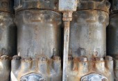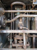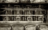 Bliska stary, duży silnik wysokoprężny z cylindrami i rurami