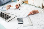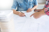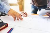 Bliska osoba inżyniera rysunku planu na niebieski Odcisk dłoni z wyposażeniem architekt, architekci, omawiając w tabeli, pracy zespołowej i koncepcja budowy przepływu pracy.