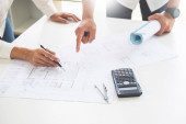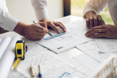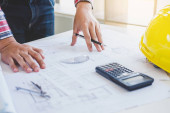Zdjęcie "Bliska osoba inżyniera rysunku planu na niebieski Odcisk dłoni z wyposażeniem architekt, architekci, omawiając w tabeli, pracy zespołowej i koncepcja budowy przepływu pracy." może być wykorzystywane do celów osobistych i komercyjnych zgodnie z warunkami zakupionej licencji Royalty-free. Obraz jest dostępny do pobrania w jakości wysokiej rozdzielczości do 5760x3840.