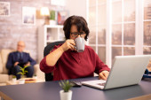 Młoda bizneswoman rozmawia podczas przeglądania na swoim laptopie