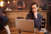 Ładna młoda kobieta trzyma karty kredytowej i patrząc na laptopa w rocznika pub