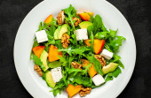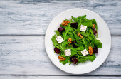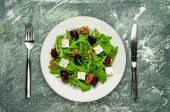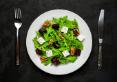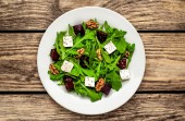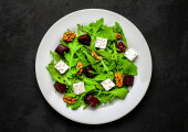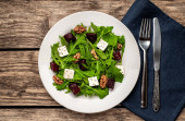 Świeża sałatka z rukolą i szpinakiem, pokroszony Burak, ser feta i orzechy włoskie