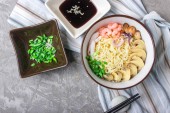 Azjatycki Makaron pszenny z owocami morza, Marynowane grzyby i scallions, posypane nasiona sezamu w misce na szarym tle. Asian style, japońskie jedzenie