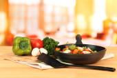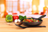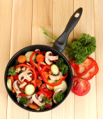 ragout warzyw na patelni, na drewnianym stole na jasnym tle