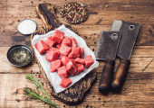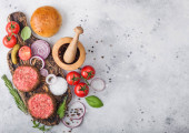 Zdjęcie "Surowe mielone domowe mięso wołowe z przyprawami i ziołami. Widok z góry z miejscem na tekst. Na szczycie deski do krojenia i marmurowe tło stołu kuchennego. Z solą z papryki i czosnkiem." może być wykorzystywane do celów osobistych i komercyjnych zgodnie z warunkami zakupionej licencji Royalty-free. Obraz jest dostępny do pobrania w jakości wysokiej rozdzielczości do 5760x3840.