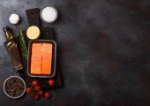 Surowe mielone domowe mięso wołowe z przyprawami i ziołami. Widok z góry z miejscem na tekst. Na szczycie deski do krojenia i marmurowe tło stołu kuchennego. Z solą z papryki i czosnkiem.