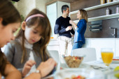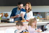 Zdjęcie "Atrakcyjny młody człowiek z jej trochę ładny córka zrobienie Sałatka razem na kuchnia w Dom." może być wykorzystywane do celów osobistych i komercyjnych zgodnie z warunkami zakupionej licencji Royalty-free. Obraz jest dostępny do pobrania w jakości wysokiej rozdzielczości do 5760x3840.