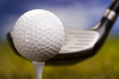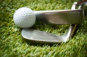 piłeczki do golfa i klub na zielone pole trawa przeciw błękitne niebo