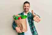 Przystojny mężczyzna trzyma worek papierowy pełne świeżych artykułów spożywczych w domu