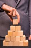 Biznesmen stawia cegły do budowy muru. Koncepcja nowy biznes, partnerstwo, integracji i uruchamiania