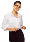 czarujący dziewczynka w turkusowa sukienka z torebki