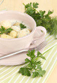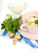 przetargu młodych ziemniaków z kwaśną śmietaną i zioła w patelni na drewniany stół szczegół