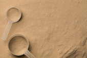 Miarki wypełnione proszkiem białkowym do żywienia fitness, aby rozpocząć trening