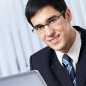 uśmiechający się biznesmen pracy z laptopem w urzędzie