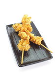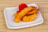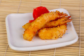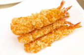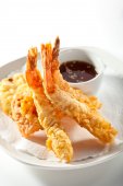 zbliżenie krewetek na sosie, podawane na białej płytce
