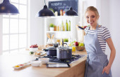 Piękna młoda kobieta gotowanie w kuchni w domu
