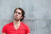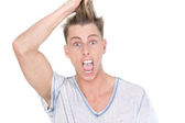 przystojny młody człowiek uśmiechający się ręką w włosy