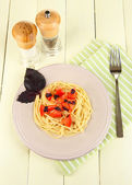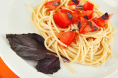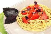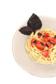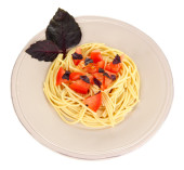 spaghetti z pomidorami i bazylia liści na białym tle