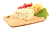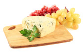 smaczny ser pleśniowy i winogron na deski do krojenia, na białym tle