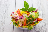 Zdjęcie "Zdrowe świeże sałatki w misce z czerwoną kapustą, pomidorem, Quinoa, zieloną sałatką i rzodkiewka na drewnianym stole. Widok z góry. Kopiuj przestrzeń." może być wykorzystywane do celów osobistych i komercyjnych zgodnie z warunkami zakupionej licencji Royalty-free. Obraz jest dostępny do pobrania w jakości wysokiej rozdzielczości do 5760x3840.