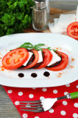 smaczne palona plastry kostnego i pomidor, sałatka z liści, na jasnym tle