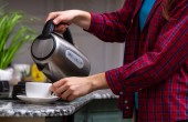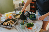 Zbliżenie stołu śniadaniowego i dłoni kobiety trzymającej duży kubek z filtrem do kawy, poring coffee.