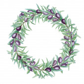 Akwarela wieniec z czarnych i złotych jagód oliwkowych. Ręcznie malowane kwiatowy granicy z oliwek owoców i gałęzi drzewa z liści isolatedon białe tło. Do projektowania, druku i tkanin.