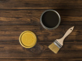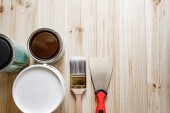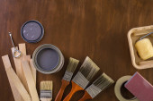 Widok z góry pędzli, cyna fioletowa farba i wałek malarski na powierzchni drewnianej