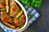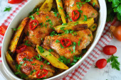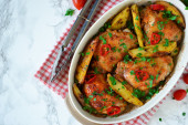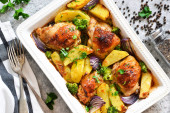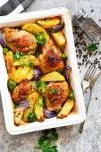 Gorący pikantny kurczak z ziemniakami i brokułami pieczone. Betonowe BAC