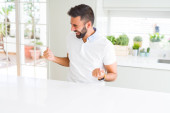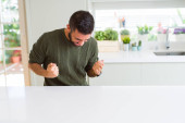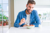 Przystojny mężczyzna jedzenie zielony groszek w domu
